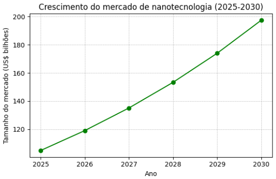 O mercado global de nanotecnologia é avaliado em US$ 104,88 bilhões em 2025 e deve atingir US$ 197,43 bilhões em 2030, crescendo em média 13,49% ao ano.